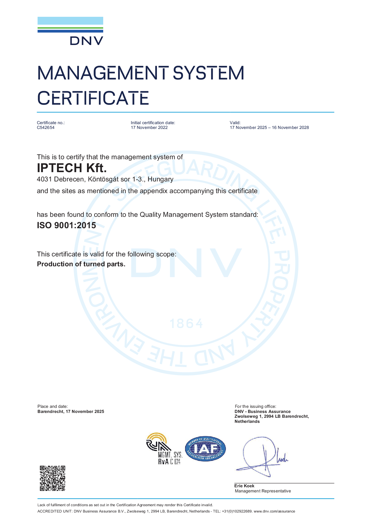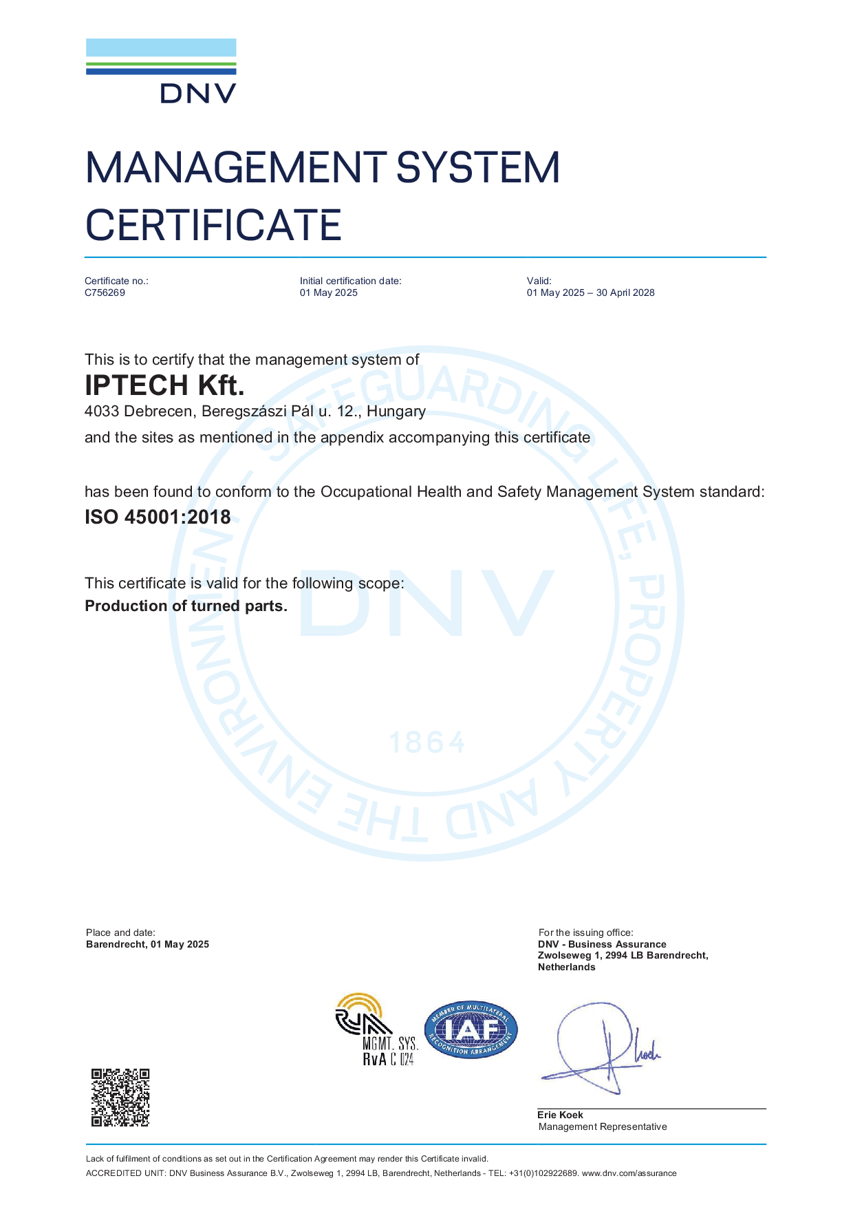 Ennek érdekében saját és megrendelőink elvárásainak megfelelően ISO 9001:2015 irányítási rendszert működtetünk, amit a jelenkor igényének megfelelően ISO 14001:2015 környezetirányítási és ISO 45001:2018 munkahelyi egészségvédelem és biztonság irányítási rendszerrel egészítettünk ki.